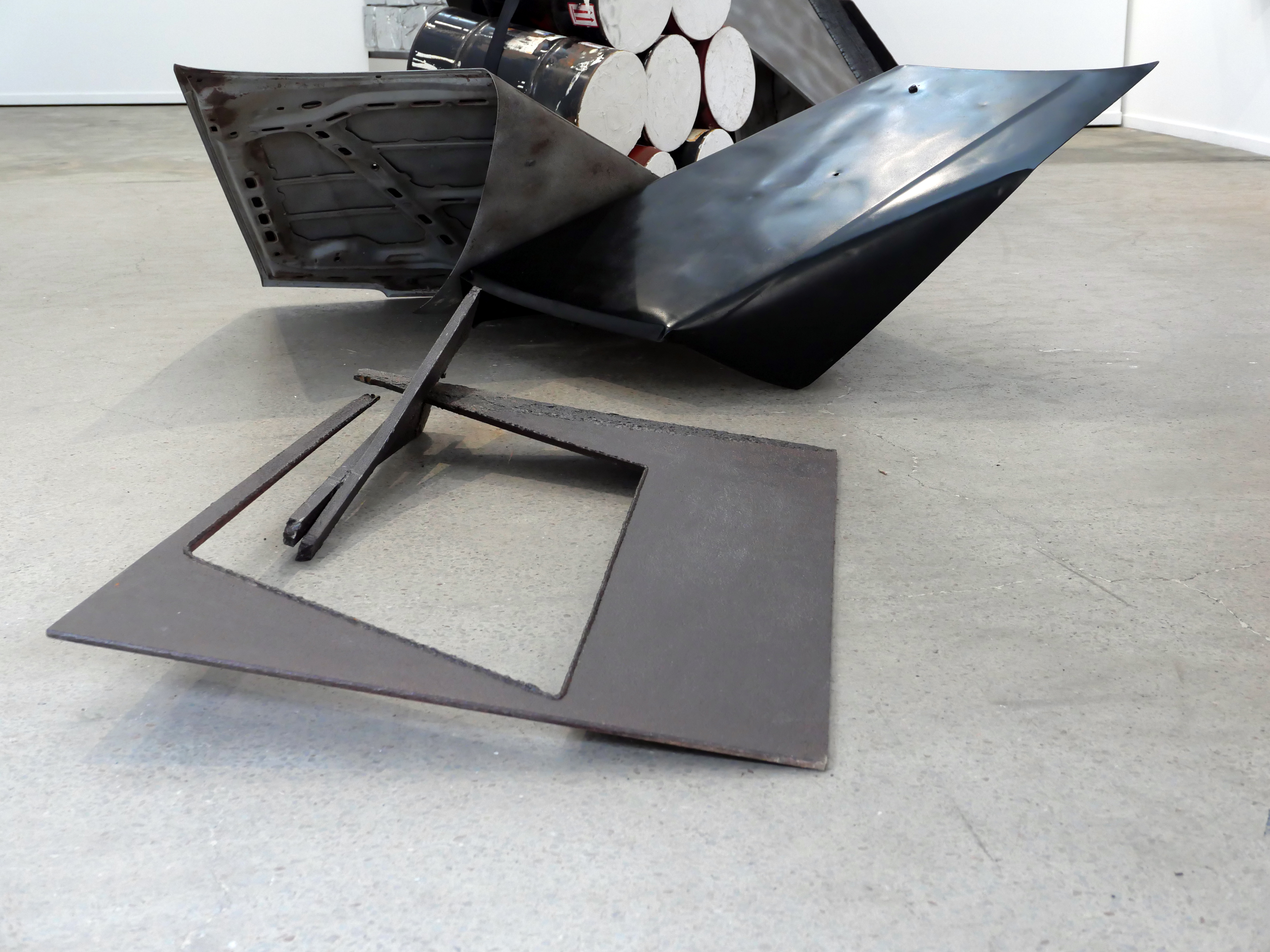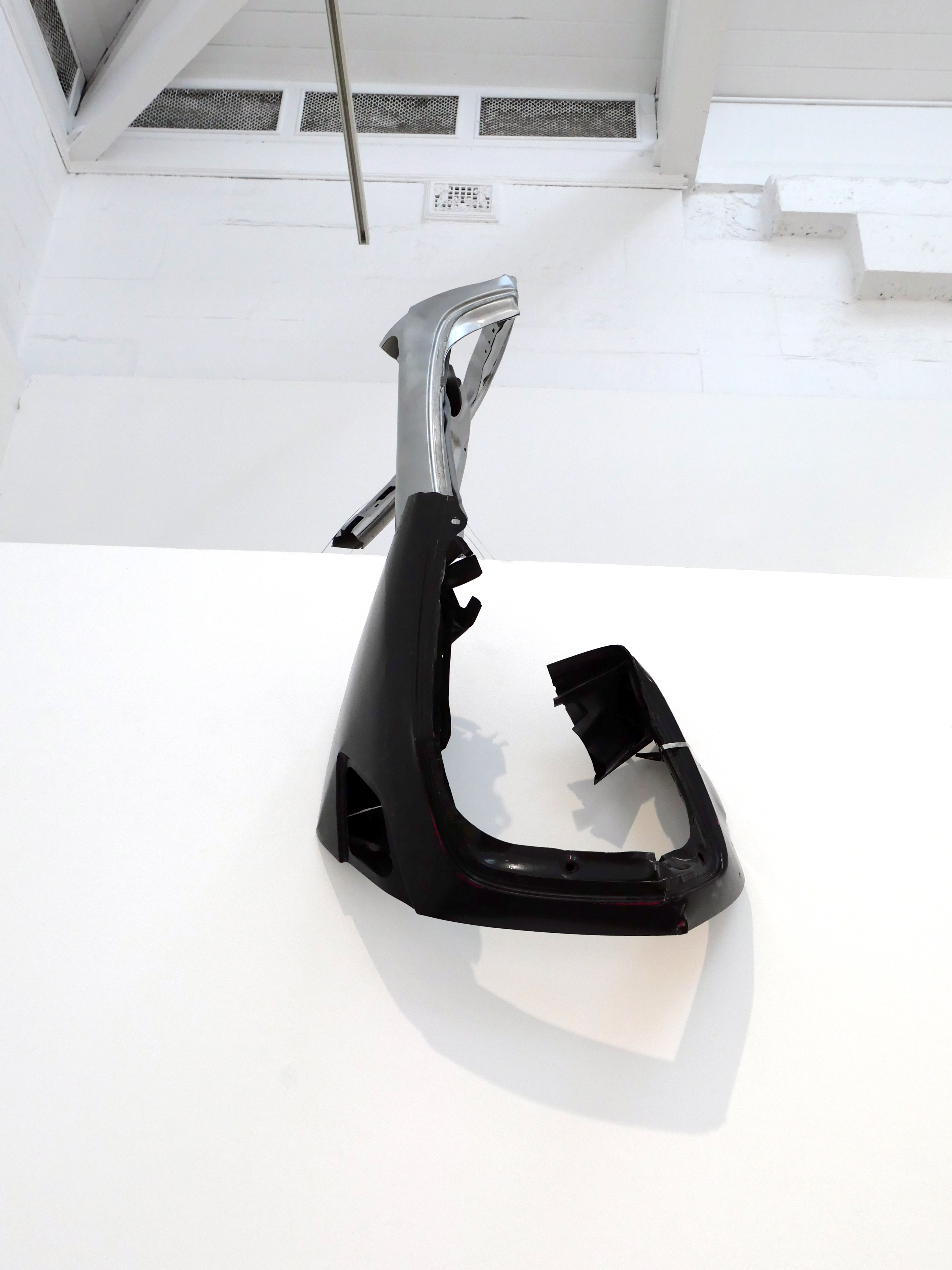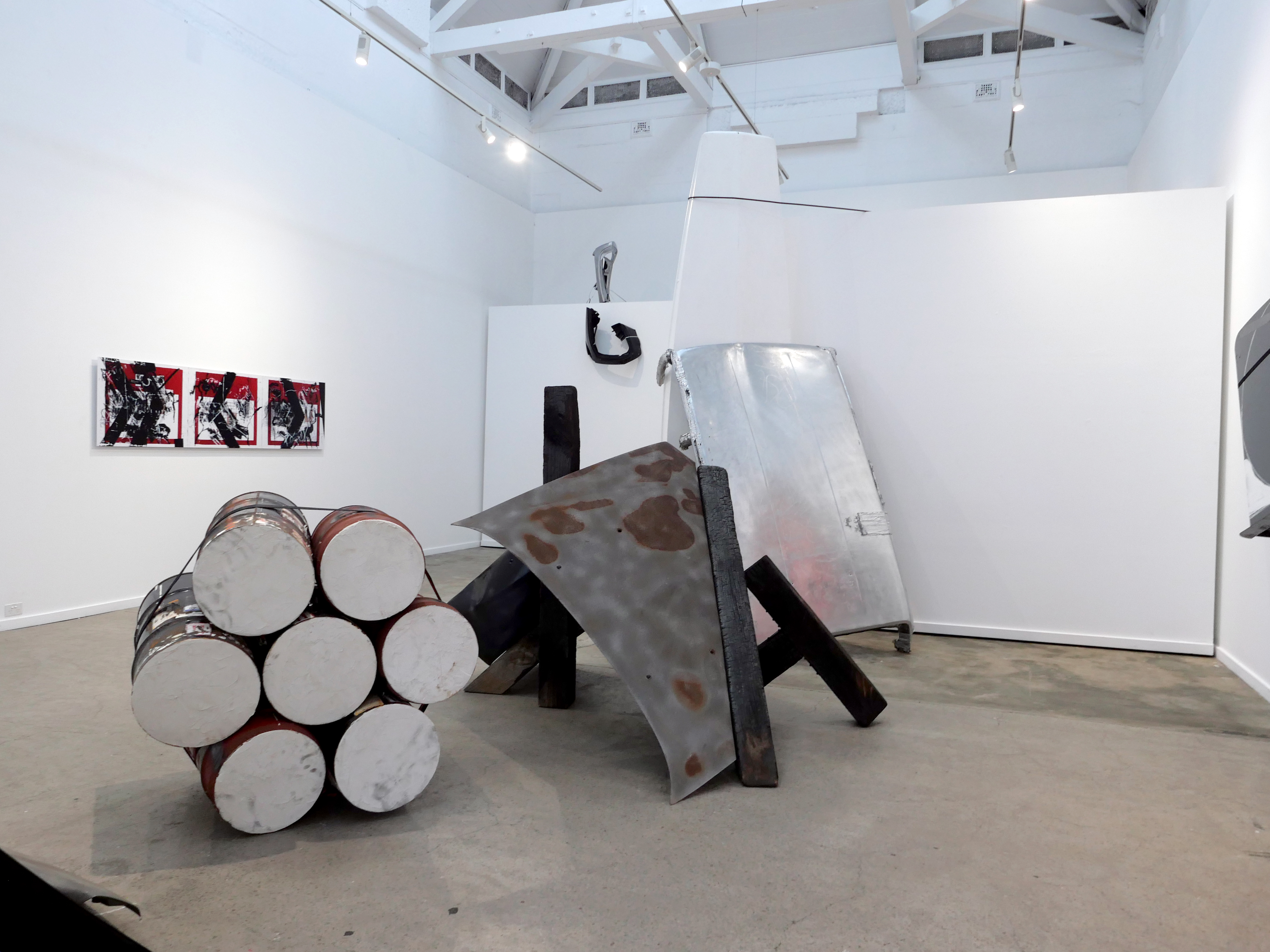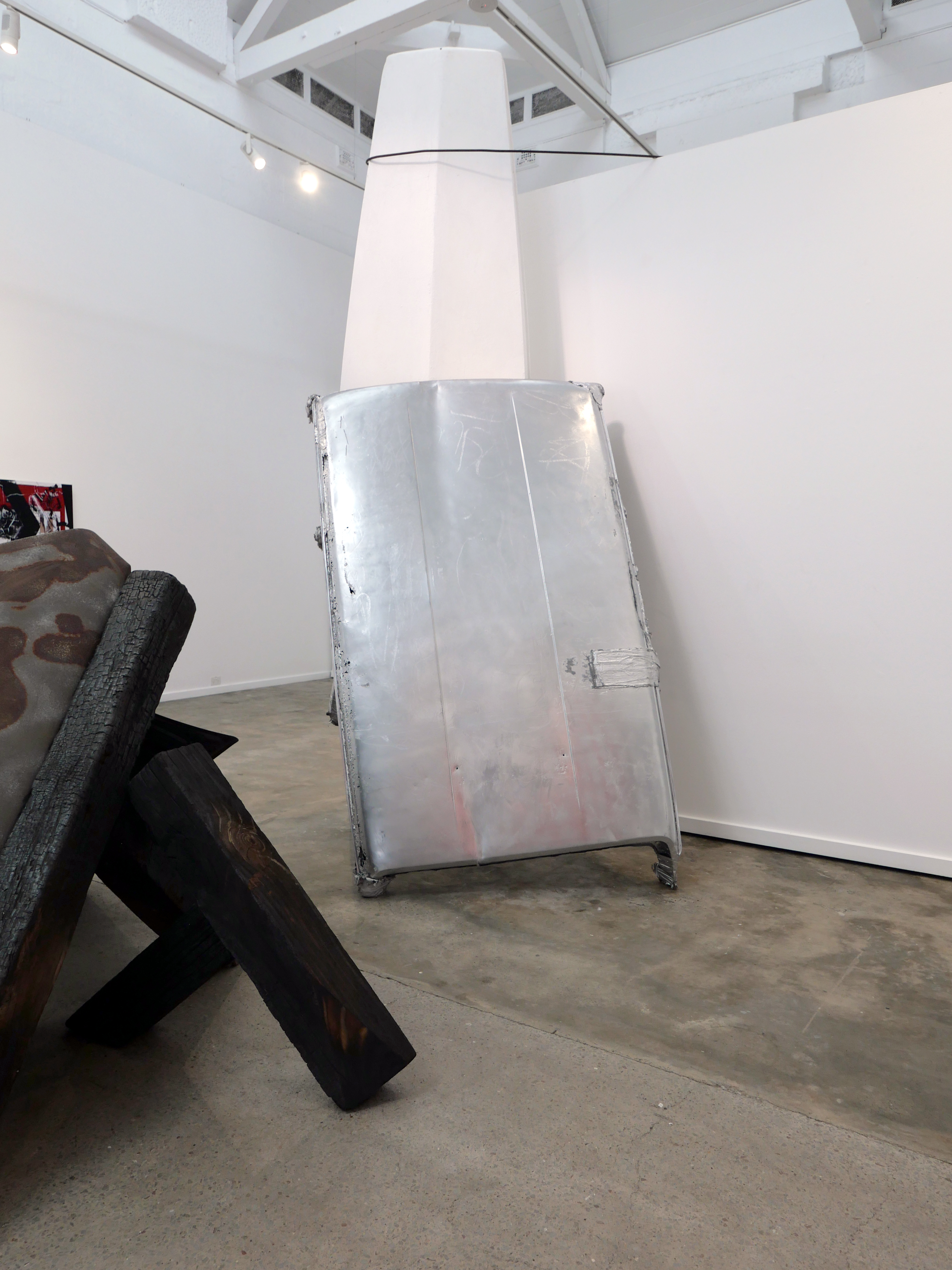The process of re-working burnt timber, car parts and signage is a material attempt to come to terms with the emotional and cognitive dissonance brought about by our consumption culture, and the commodification and mediatisation of all experience. This interior installation fills the gallery space, angular forms dissecting the room and directing the viewer, taking from minimalism the critique of interiority implicit in body-scale sculptural work and asking questions of the viewer in the face of incomprehensible systemic collapse of the natural (and in turn human) world.