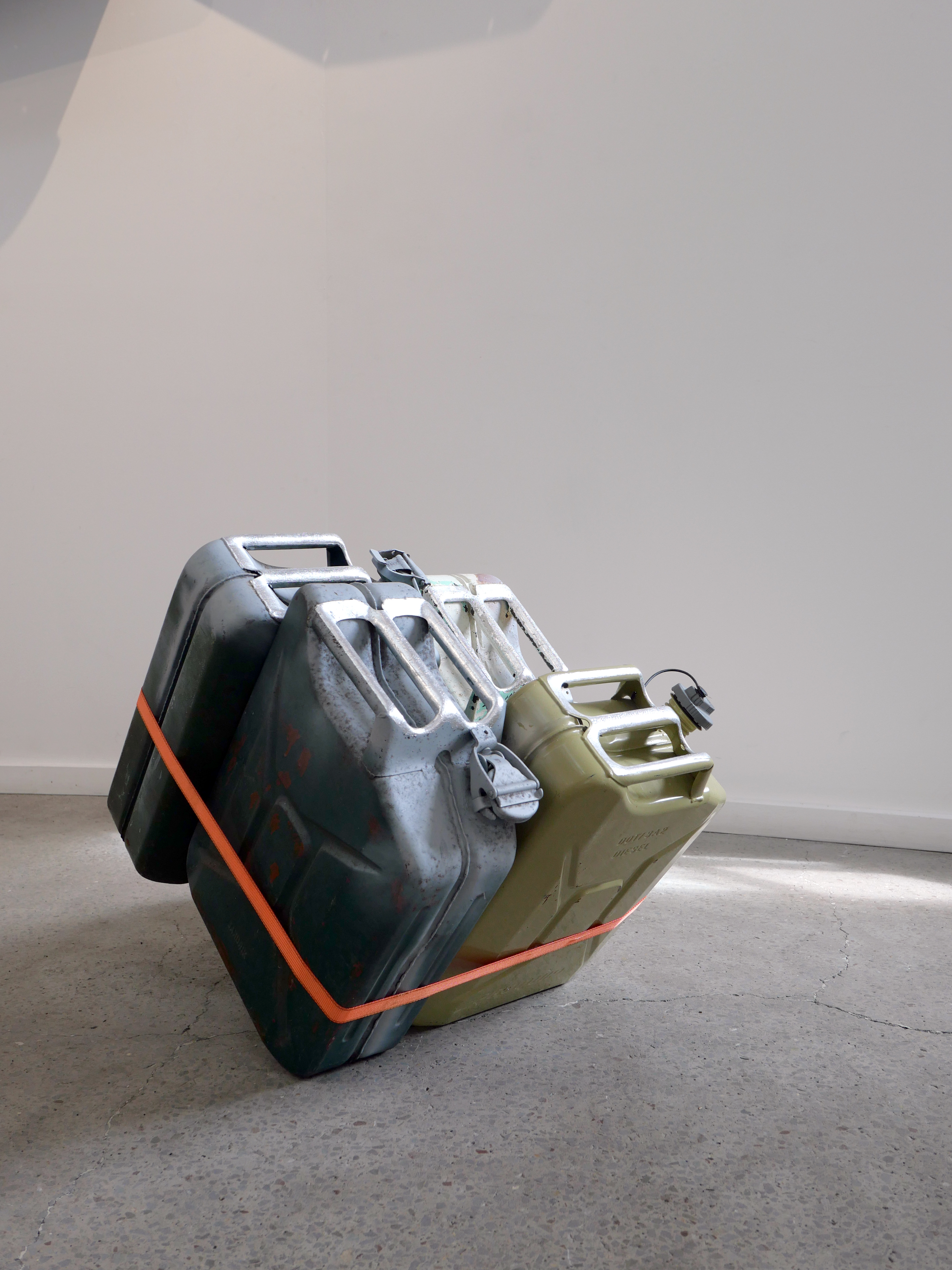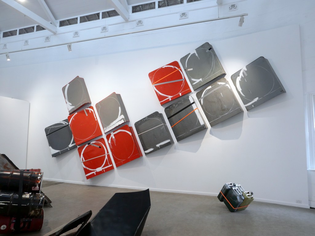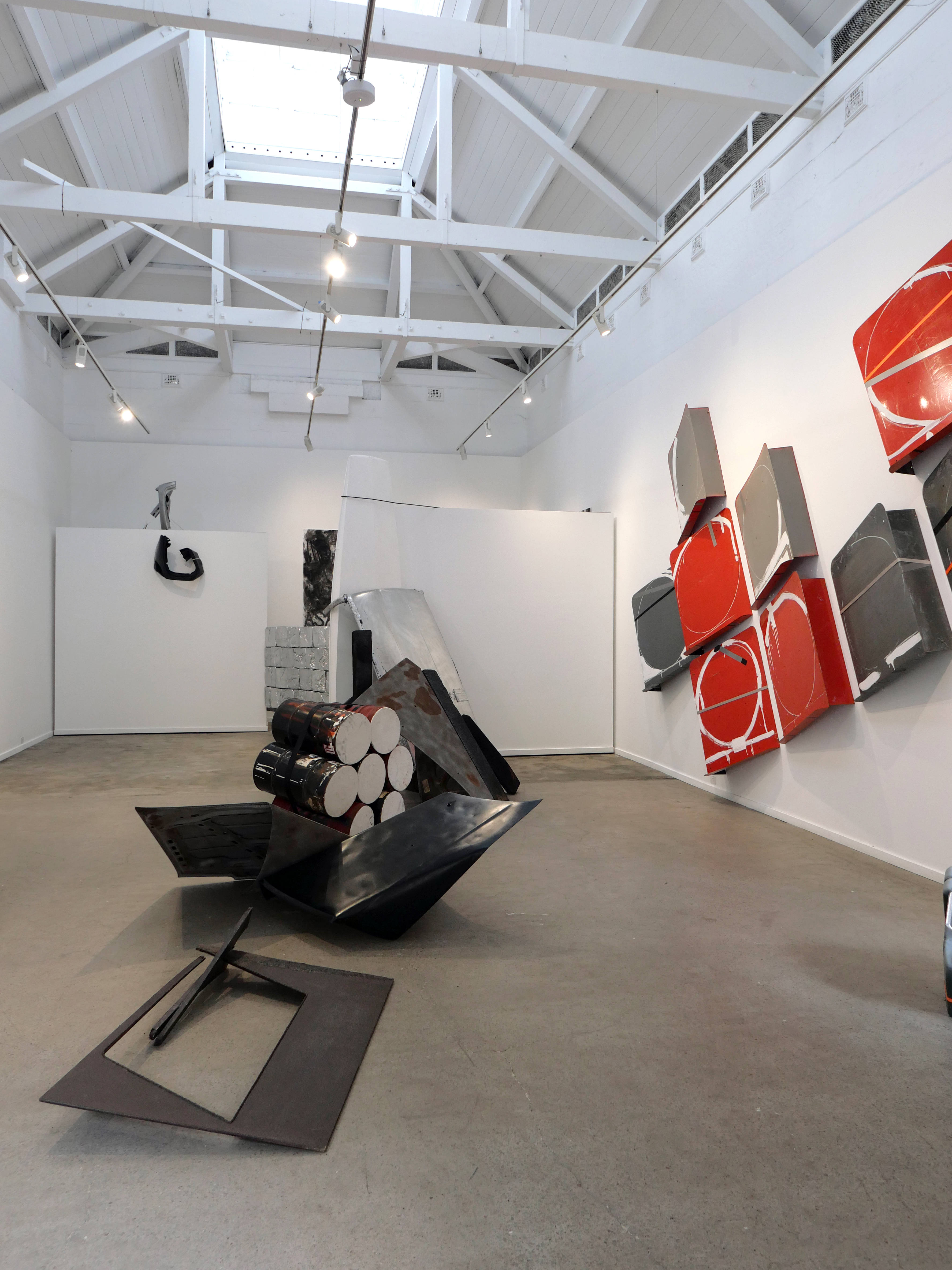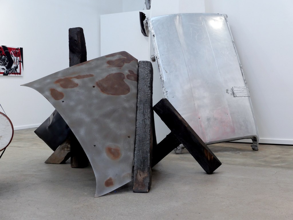 The process of re-working burnt timber, car parts and signage is a material attempt to come to terms with the emotional and cognitive dissonance brought about by our consumption culture, and the commodification and mediatisation of all experience. This interior installation fills the gallery space, angular forms dissecting the room and directing the viewer, taking from minimalism the critique of interiority implicit in body-scale sculptural work and asking questions of the viewer in the face of incomprehensible systemic collapse of the natural (and in turn human) world.